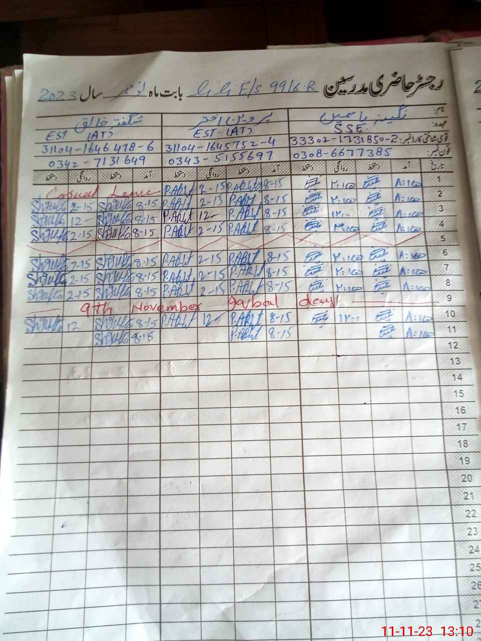 | CNIC | Full Name | Designation | R/C | Absence During Last Calender Month |