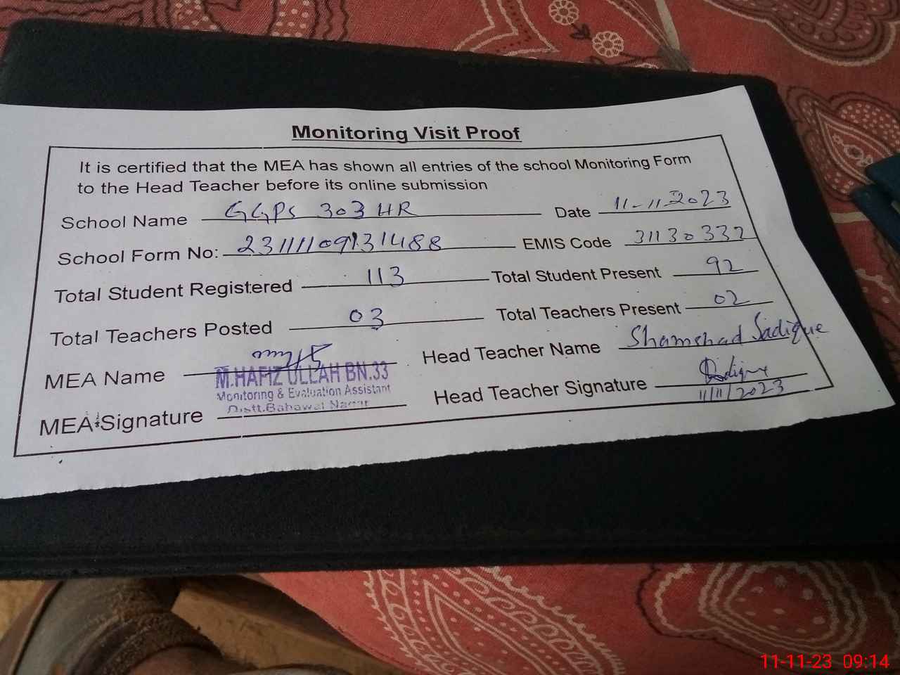 | Monitoring Date: 11-11-2023 | Start Time: 11-11-2023 08:50 AM | End Time: 11-11-2023 09:16 AM | Name of MEA: Mu**** Ha**** BN**** | |