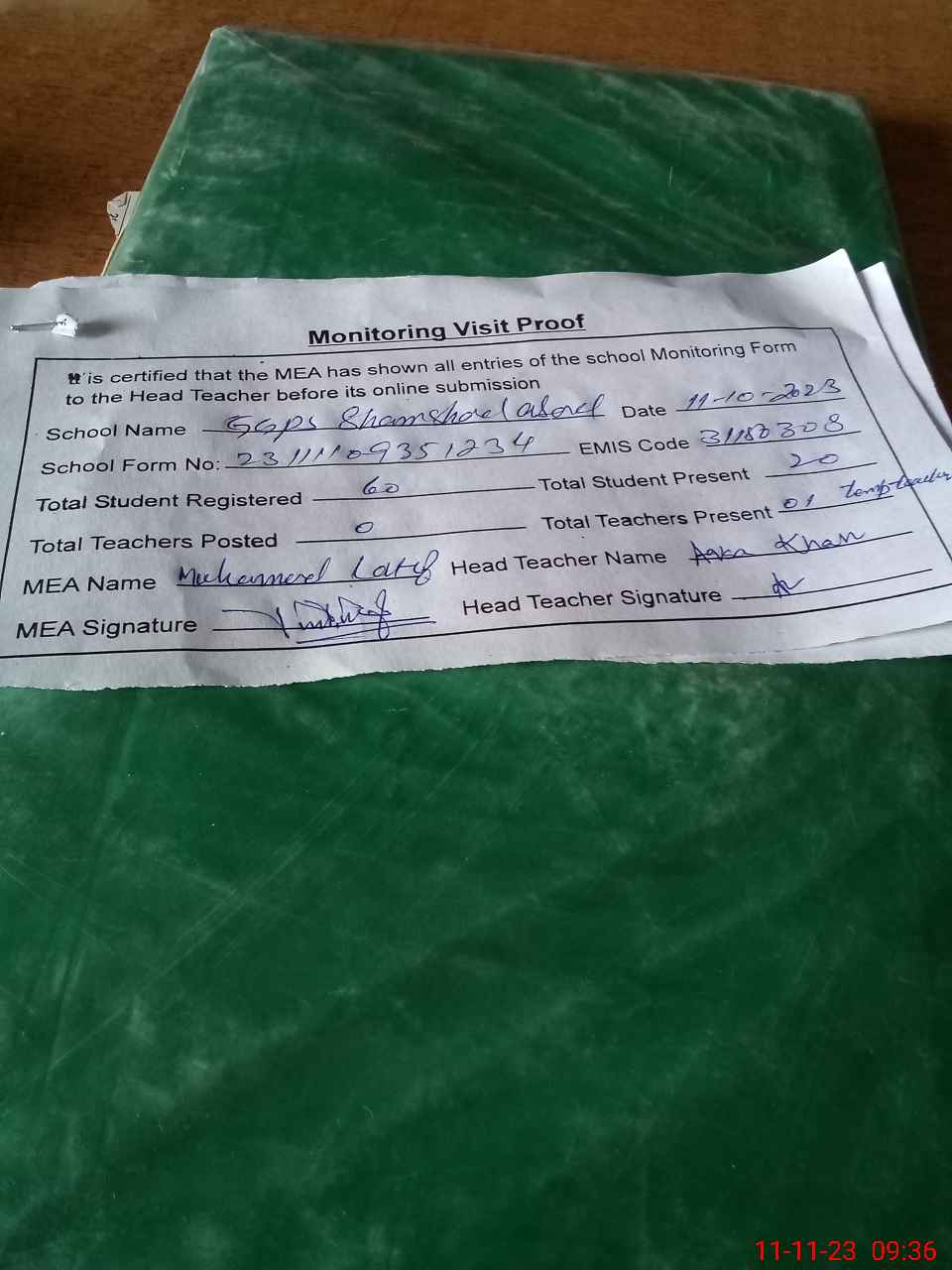 | Attendance Register | Head Teacher | MEA with School | Visit Proof |
