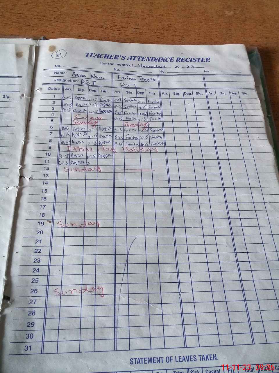 | Leave | Duty | Absent | Maternity | Medical | Ex- Pak |