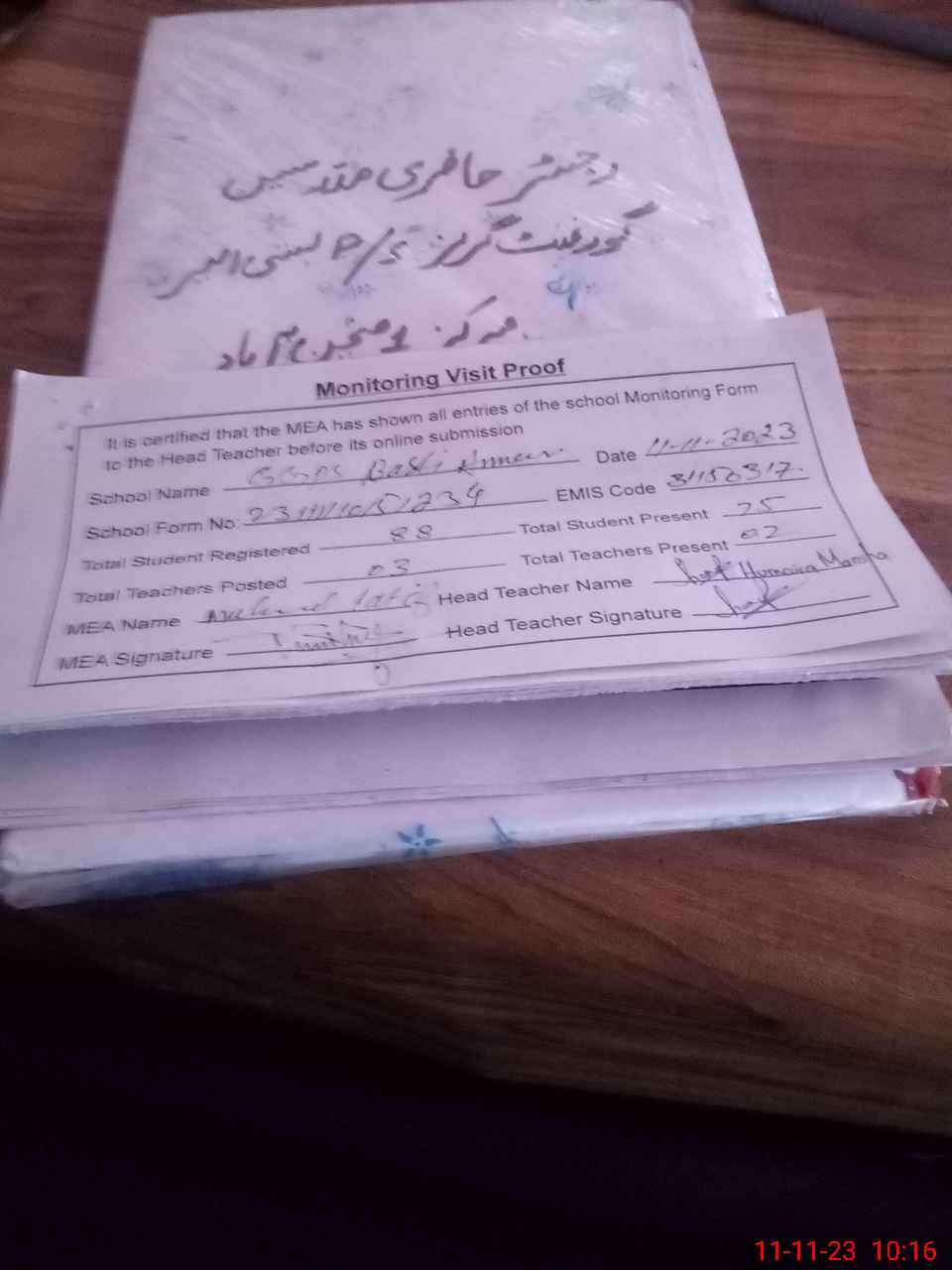 | Attendance Register | Head Teacher | MEA with School | Visit Proof |