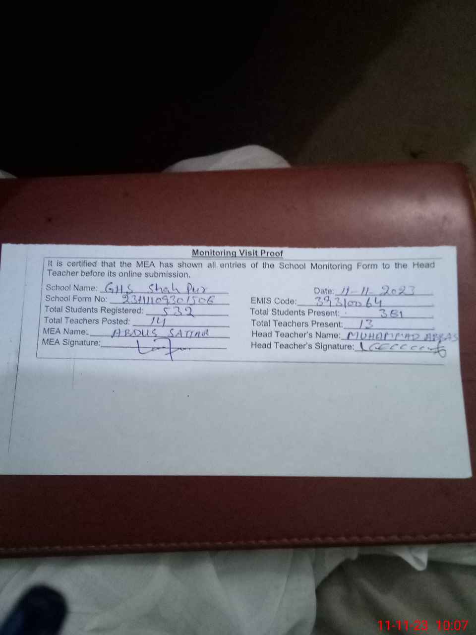 | Attendance Register | Head Teacher | MEA with School | Visit Proof |
