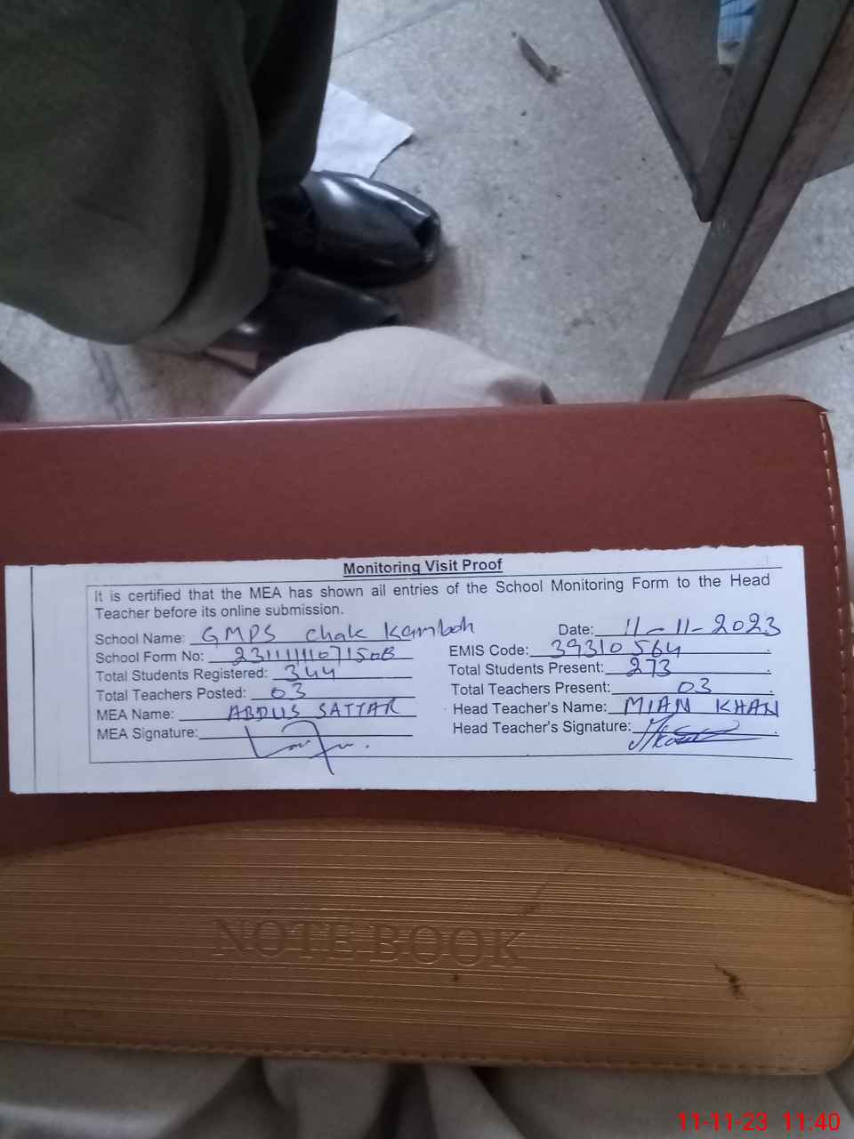 | Attendance Register | Head Teacher | MEA with School | Visit Proof |