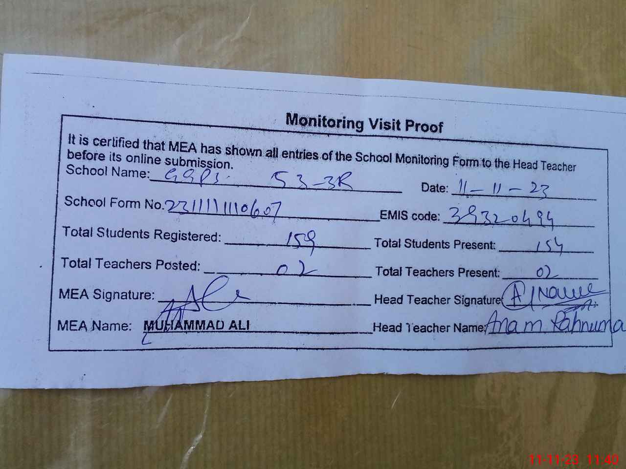 | Attendance Register | Head Teacher | MEA with School | Visit Proof |