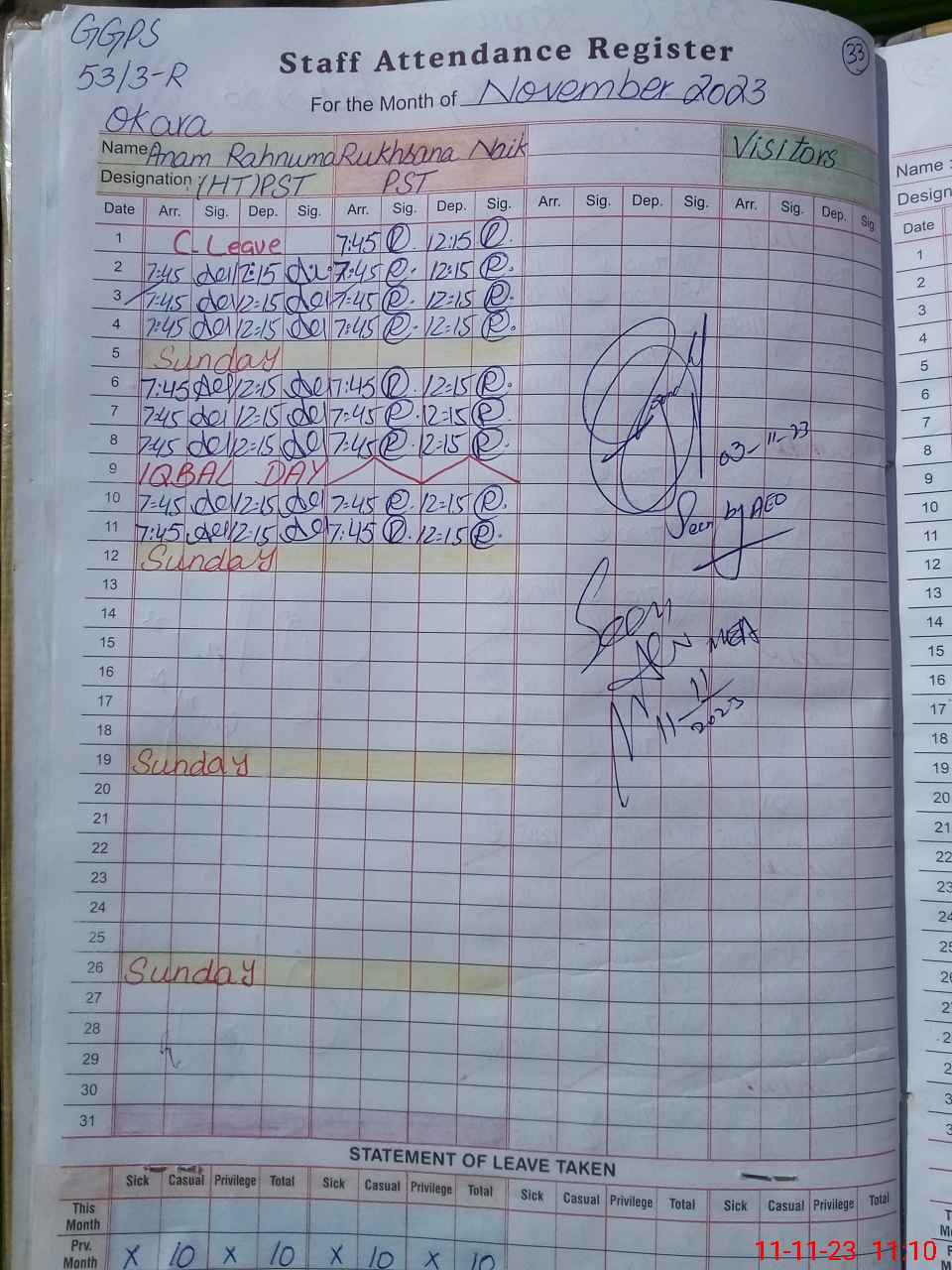 | Monitoring Date: 11-11-2023 | Start Time: 11-11-2023 11:10 AM | End Time: 11-11-2023 11:43 AM | Name of MEA: MO**** AL**** (R**** | |