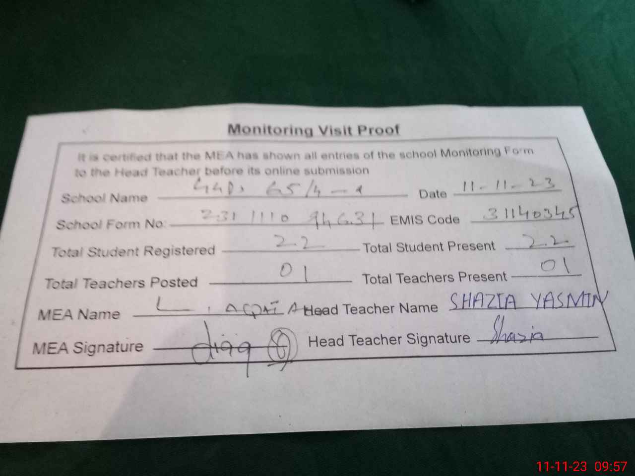 | Attendance Register | Head Teacher | MEA with School | Visit Proof |