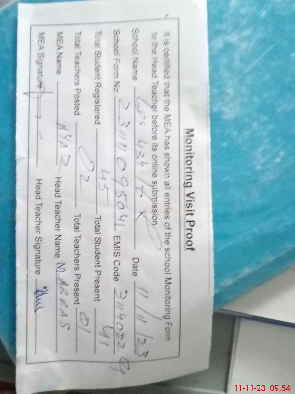| Attendance Register | Head Teacher | MEA with School | Visit Proof |