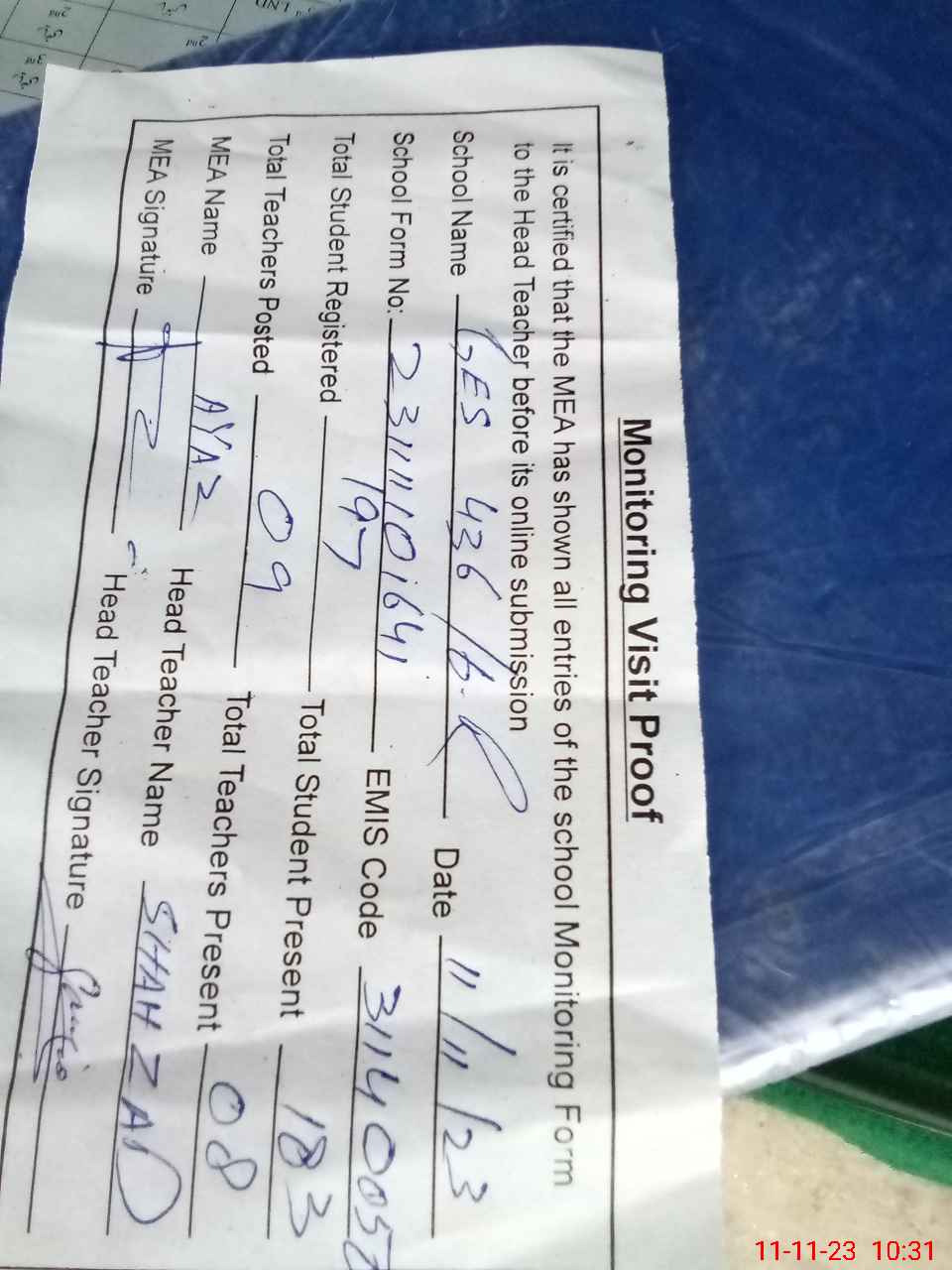 | Attendance Register | Head Teacher | MEA with School | Visit Proof |