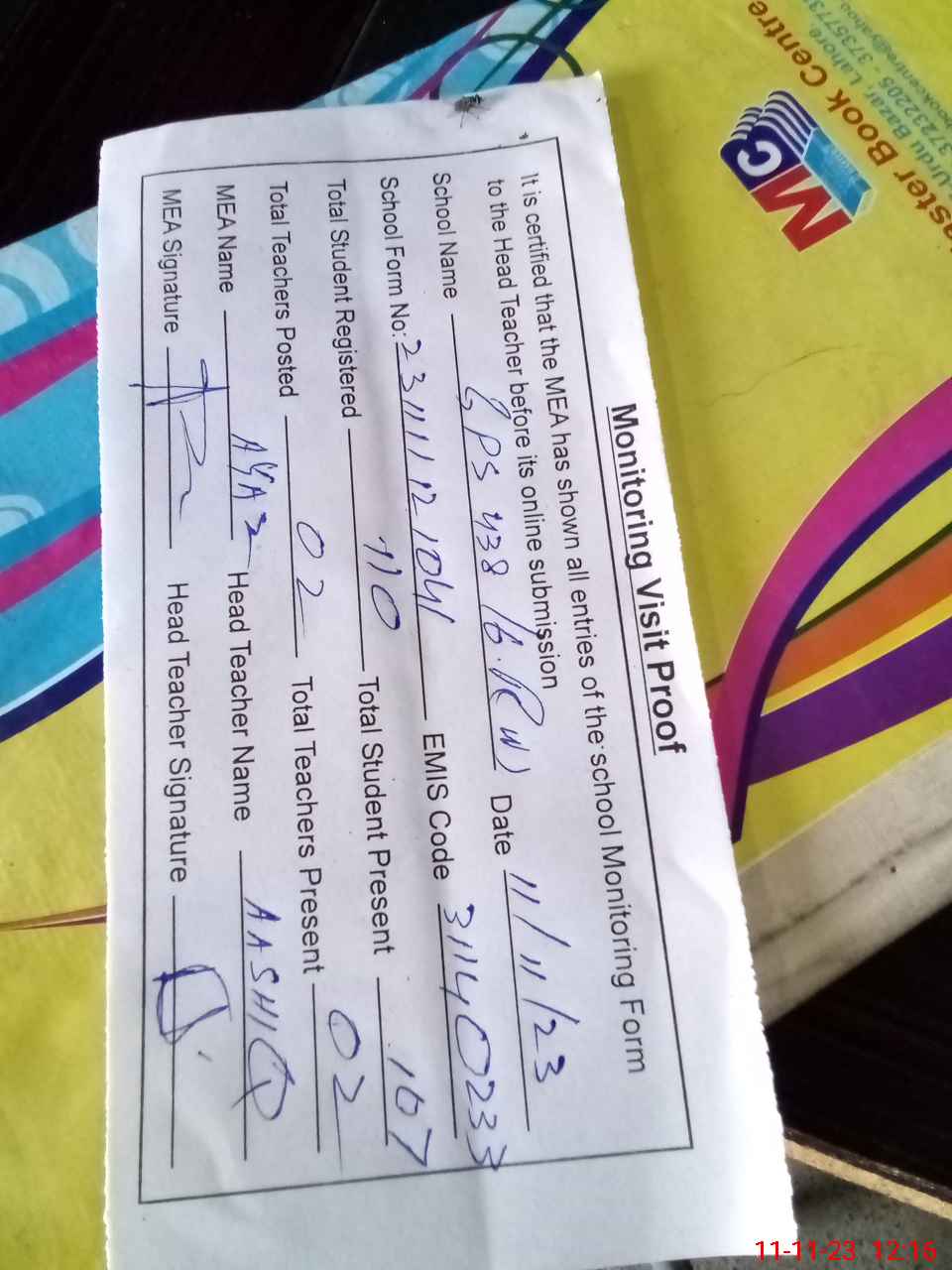 | Attendance Register | Head Teacher | MEA with School | Visit Proof |