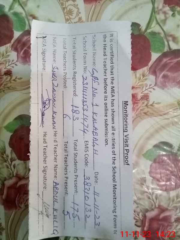 | EMIS Code: 38310132 | Name of School: GPS NO. 1 KALA BAGH | |||