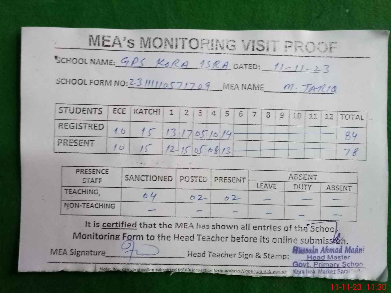 | Attendance Register | Head Teacher | MEA with School | Visit Proof |