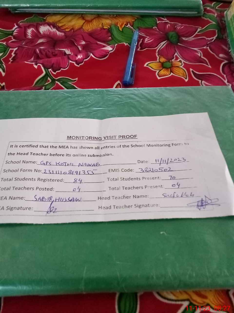 | EMIS Code: 38210502 | Name of School: GPS KOTHI NAWAB | |||