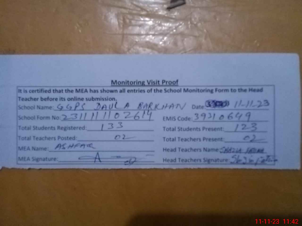 | Attendance Register | Head Teacher | MEA with School | Visit Proof |