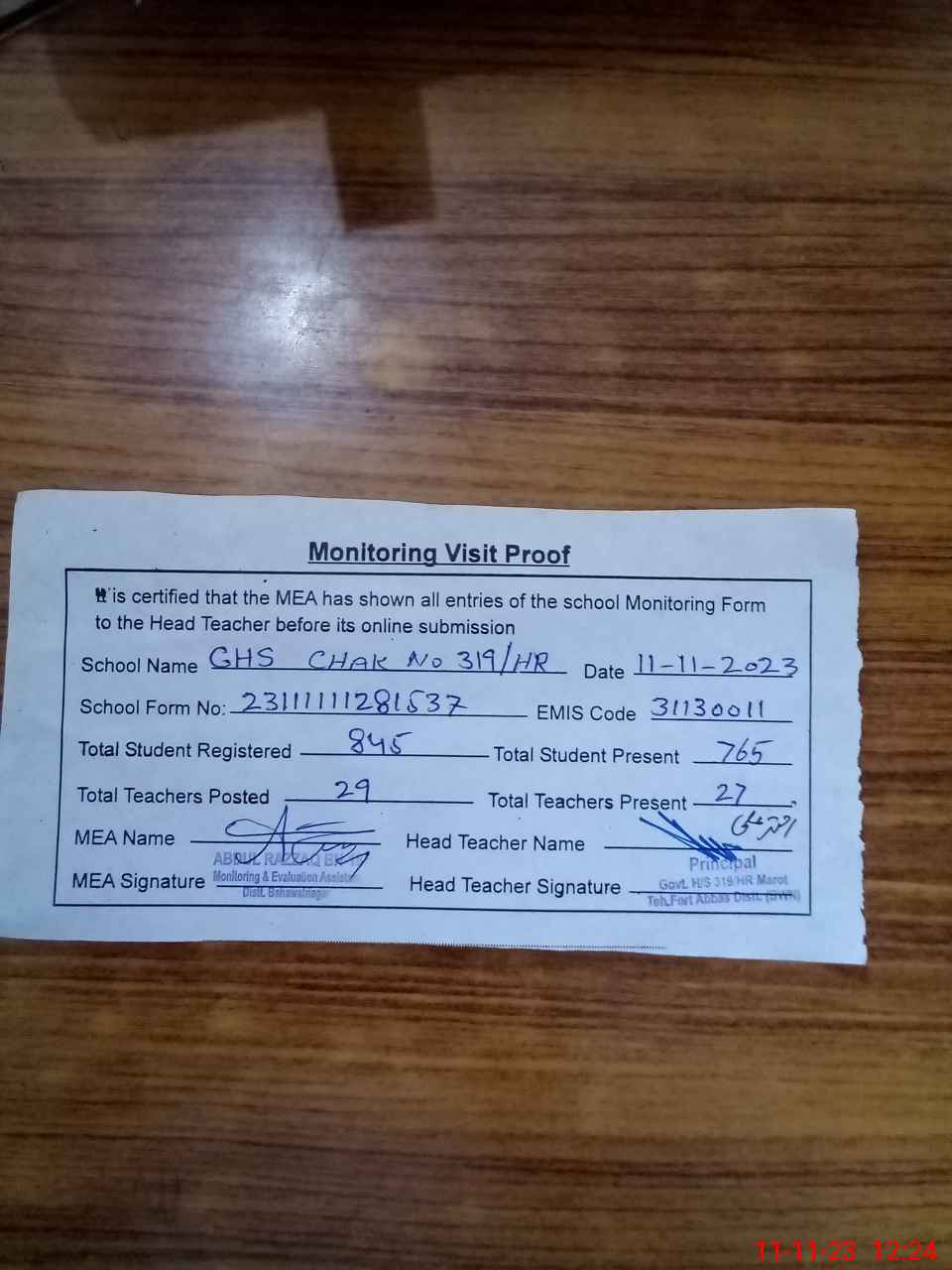 | EMIS Code: 31130011 | Name of School: GHSS CHAK 319/HR | |||