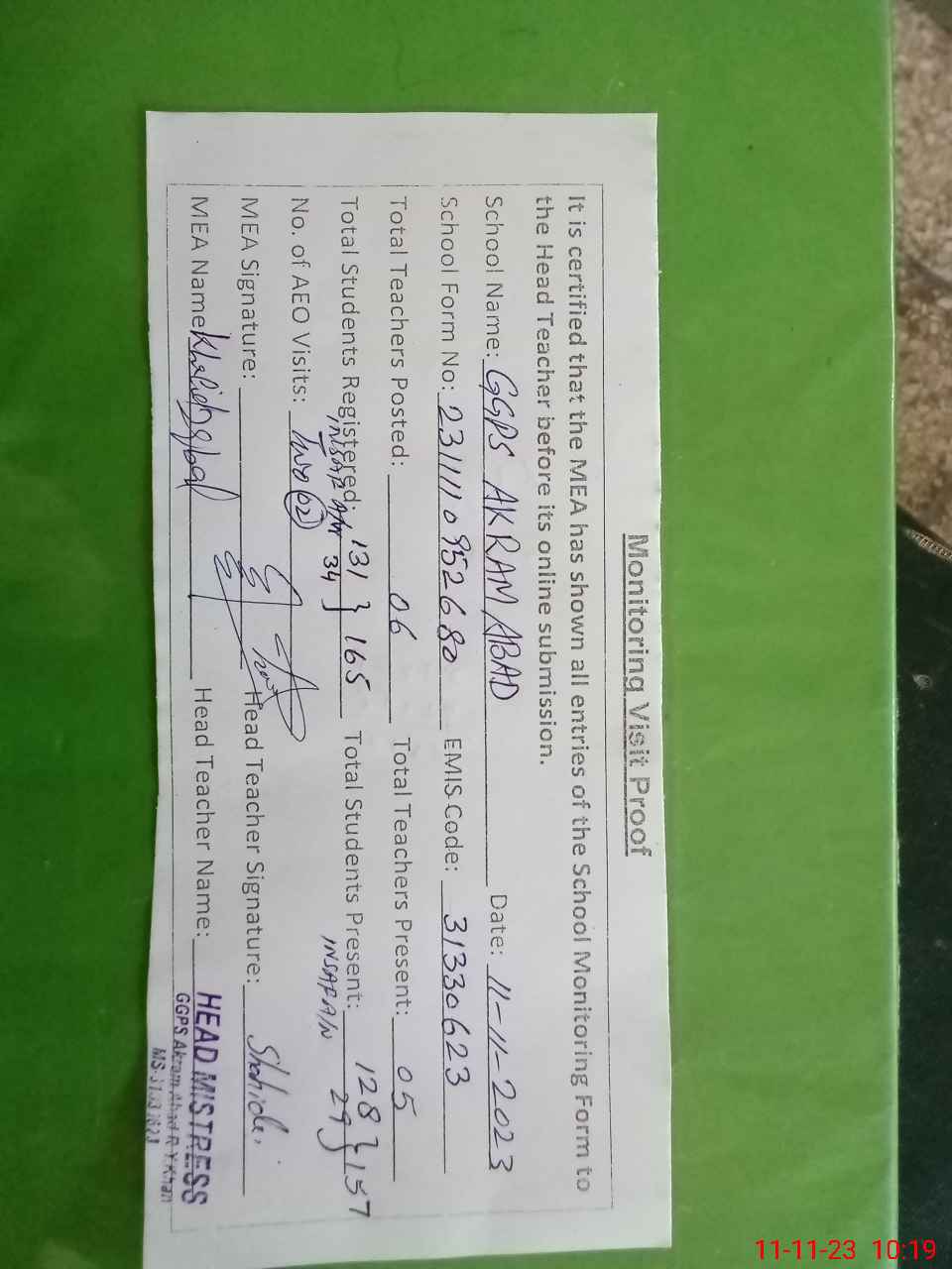 | Monitoring Date: 11-11-2023 | Start Time: 11-11-2023 09:50 AM | End Time: 11-11-2023 10:28 AM | Name of MEA: Kh**** Iq**** | |