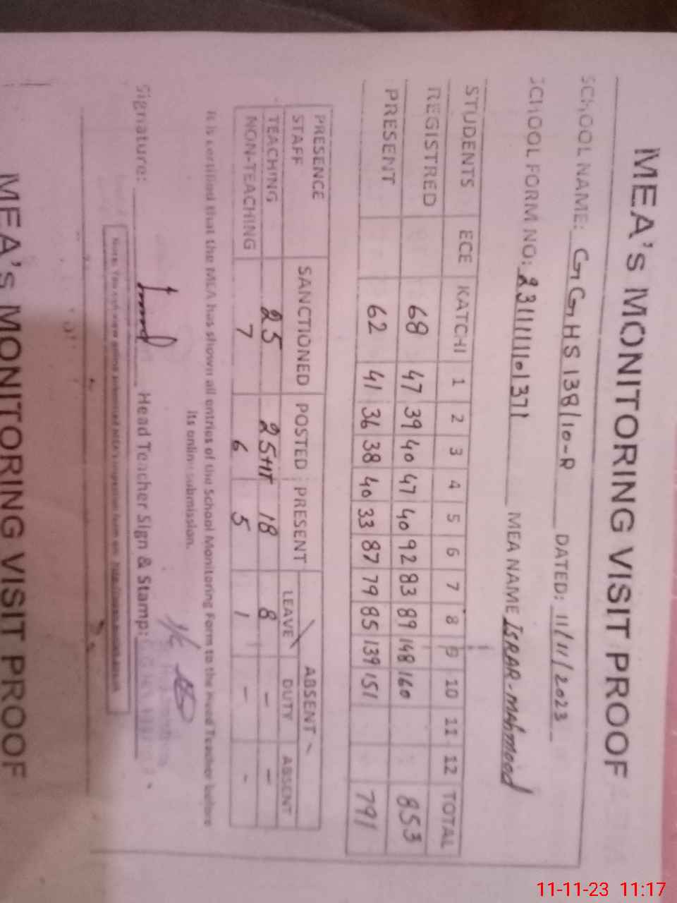 | Attendance Register | Head Teacher | MEA with School | Visit Proof |