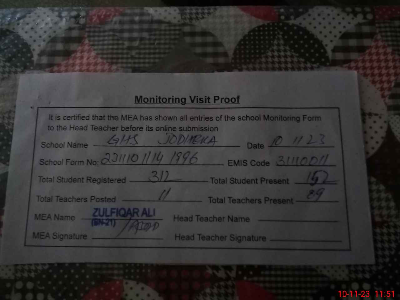 | Monitoring Date: 10-11-2023 | Start Time: 10-11-2023 11:14 AM | End Time: 10-11-2023 11:51 AM | Name of MEA: Zu**** Al**** BN**** | |