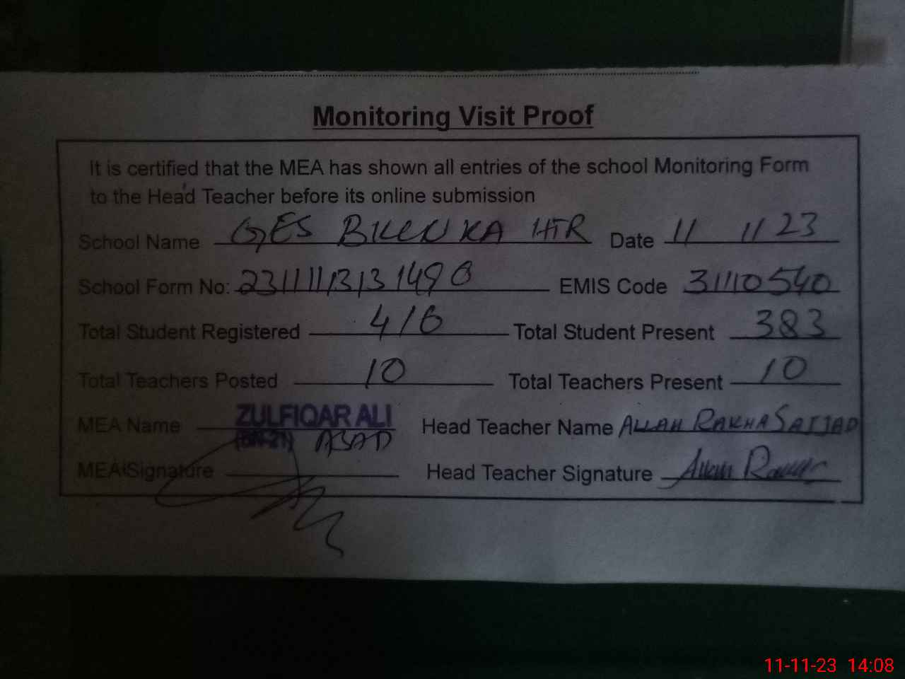 | Attendance Register | Head Teacher | MEA with School | Visit Proof |
