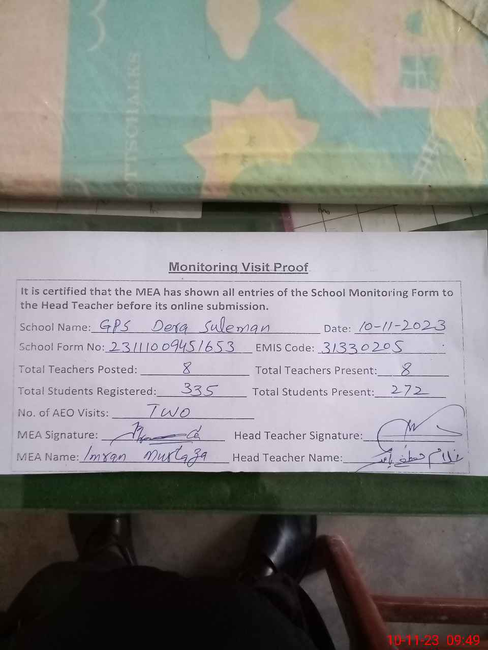 | Attendance Register | Head Teacher | MEA with School | Visit Proof |