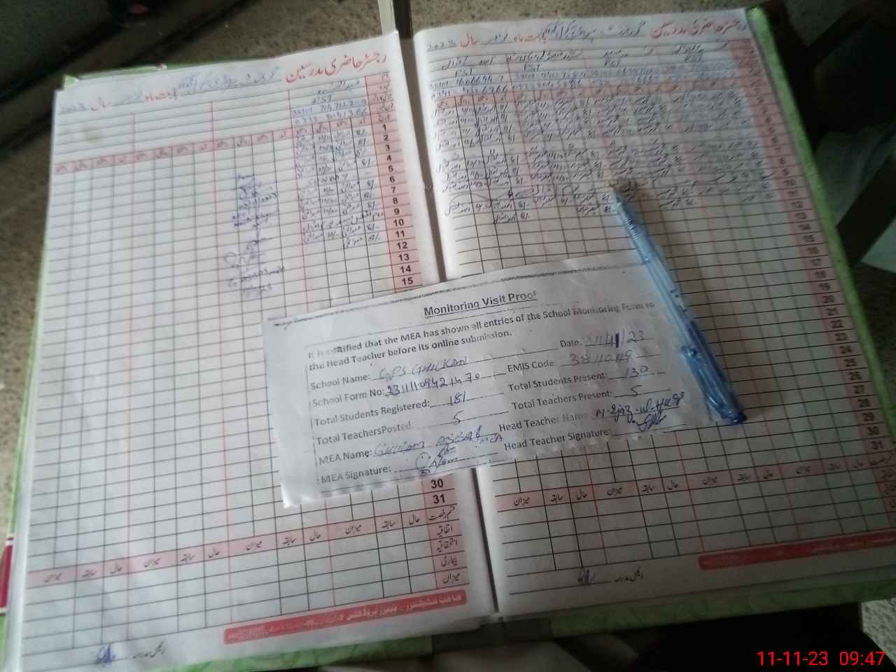 | Attendance Register | Head Teacher | MEA with School | Visit Proof |
