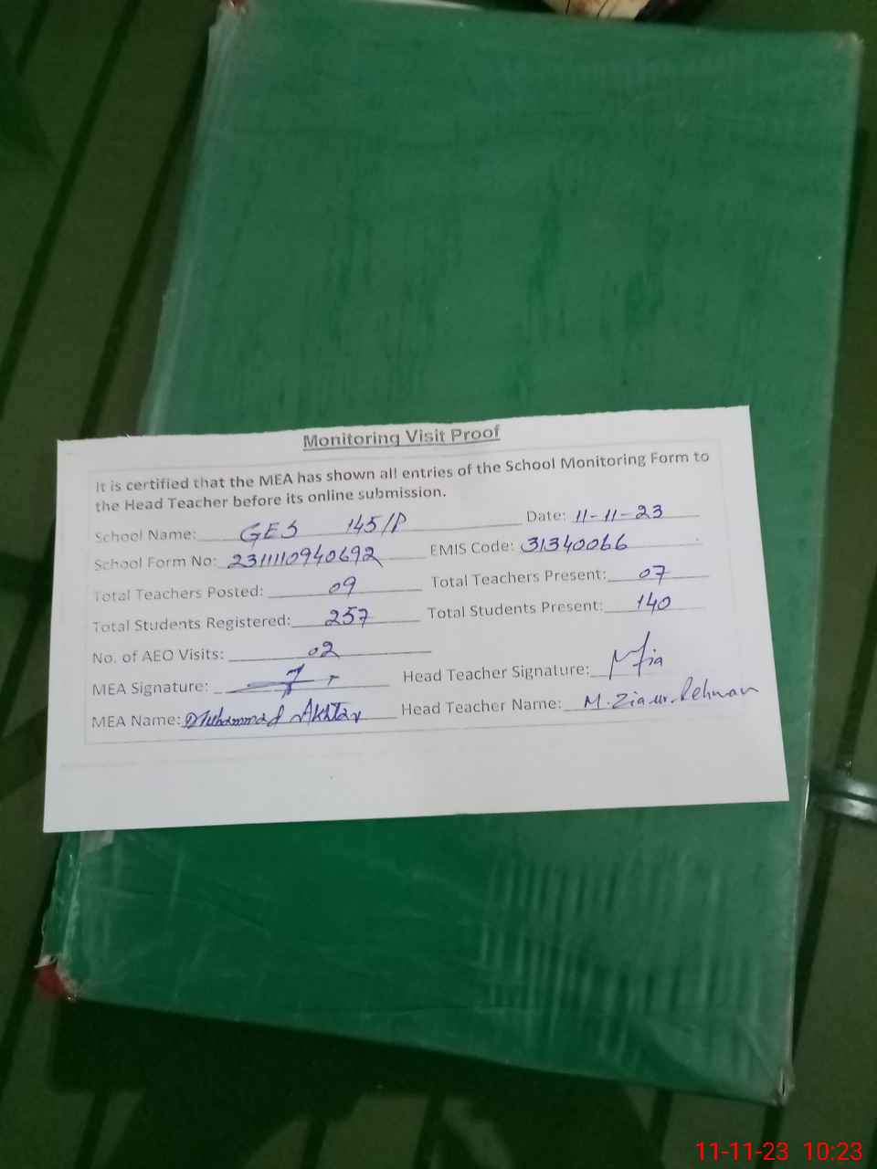 | Attendance Register | Head Teacher | MEA with School | Visit Proof |