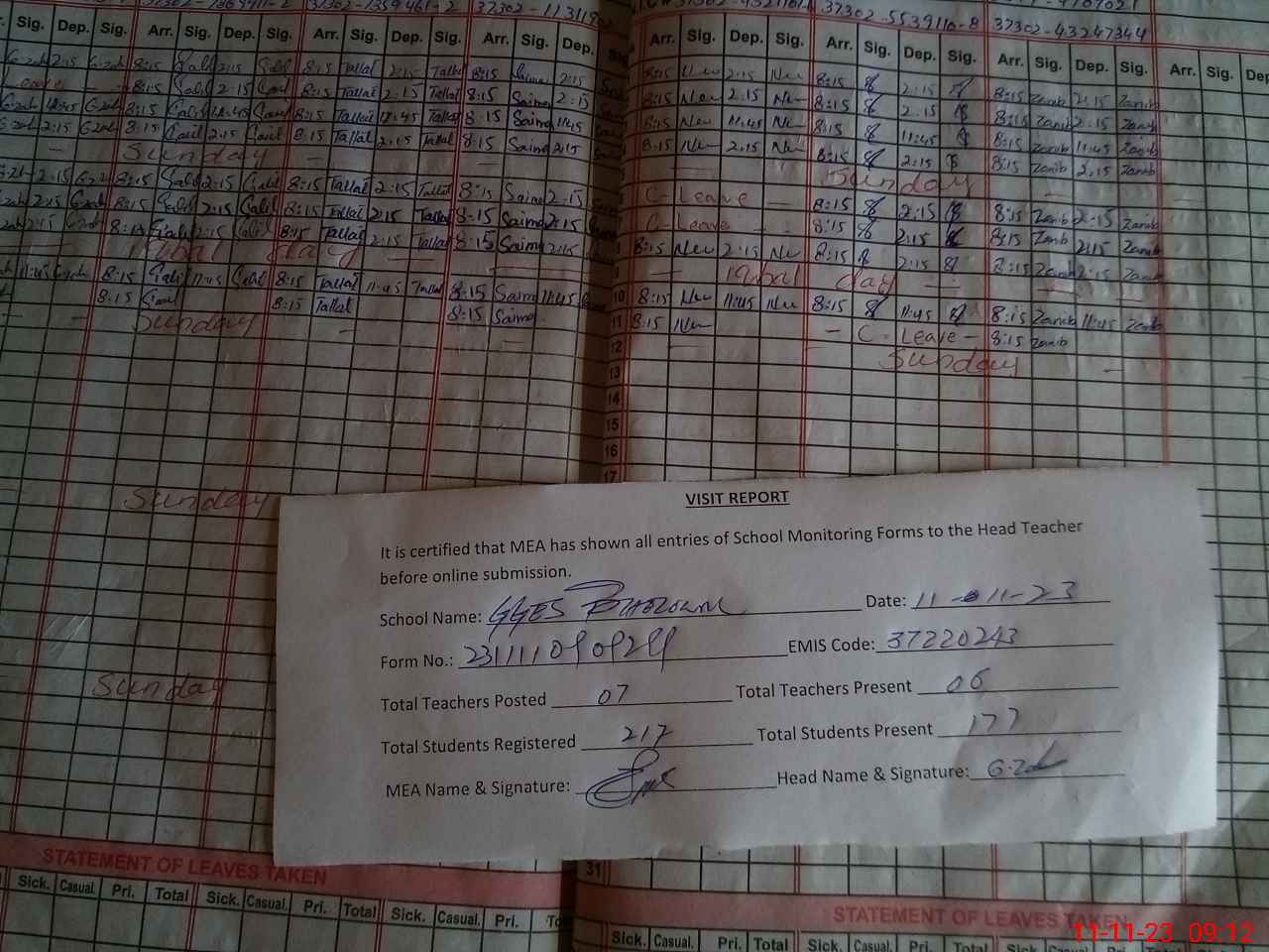 | Attendance Register | Head Teacher | MEA with School | Visit Proof |