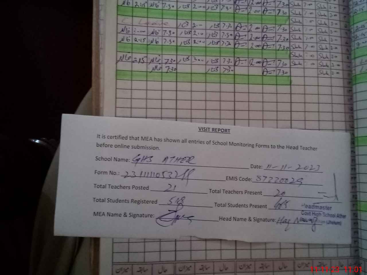 | Attendance Register | Head Teacher | MEA with School | Visit Proof |