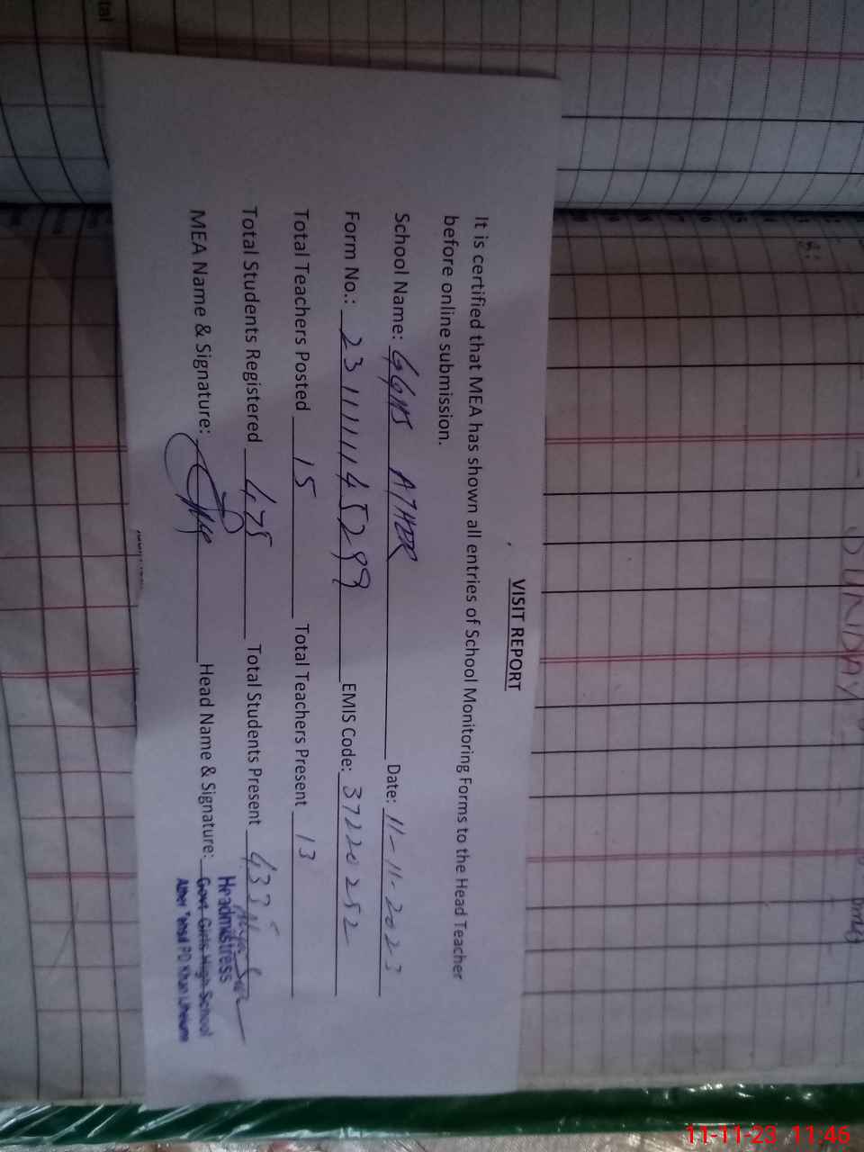 | Attendance Register | Head Teacher | MEA with School | Visit Proof |