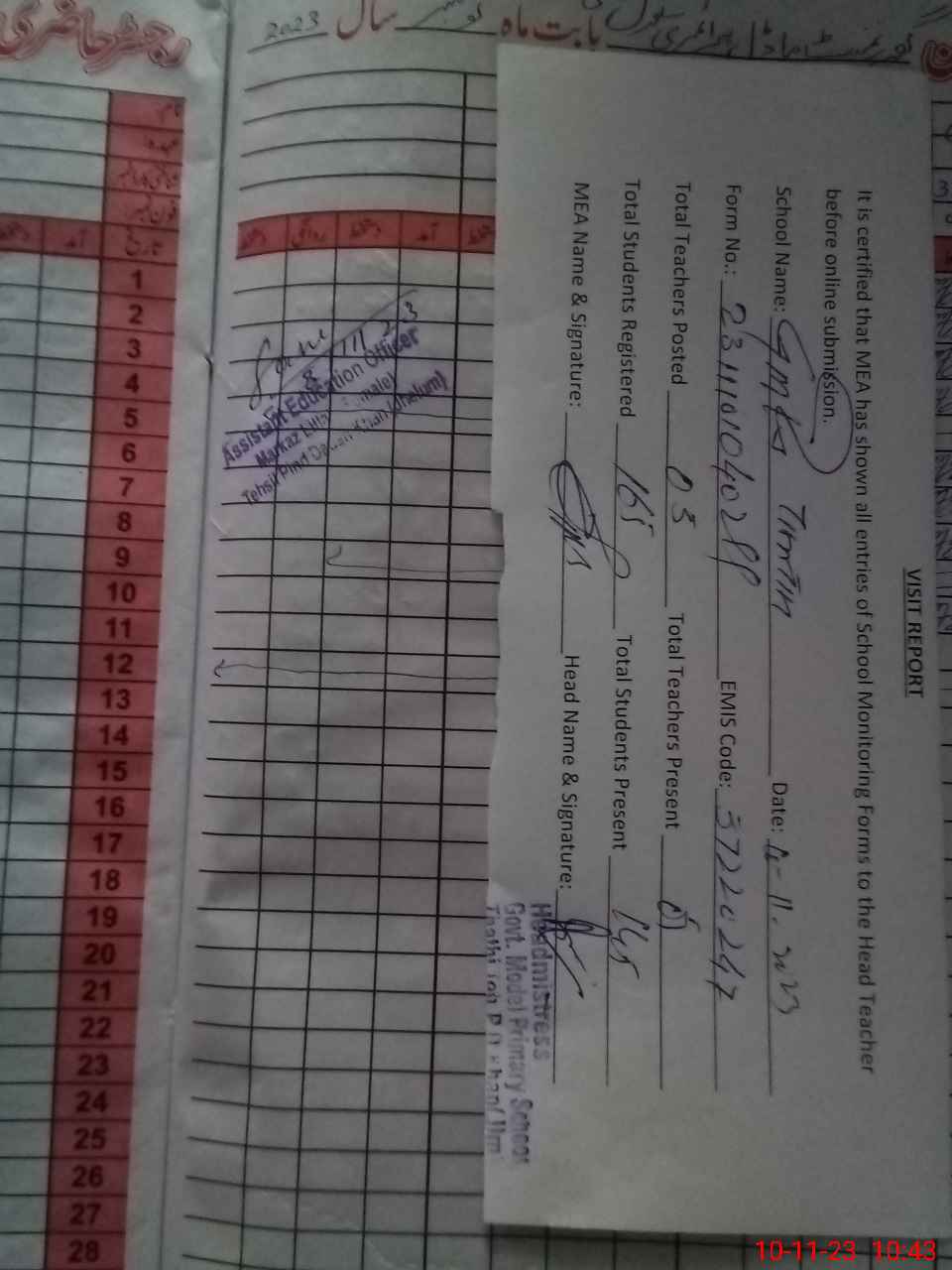 | Attendance Register | Head Teacher | MEA with School | Visit Proof |