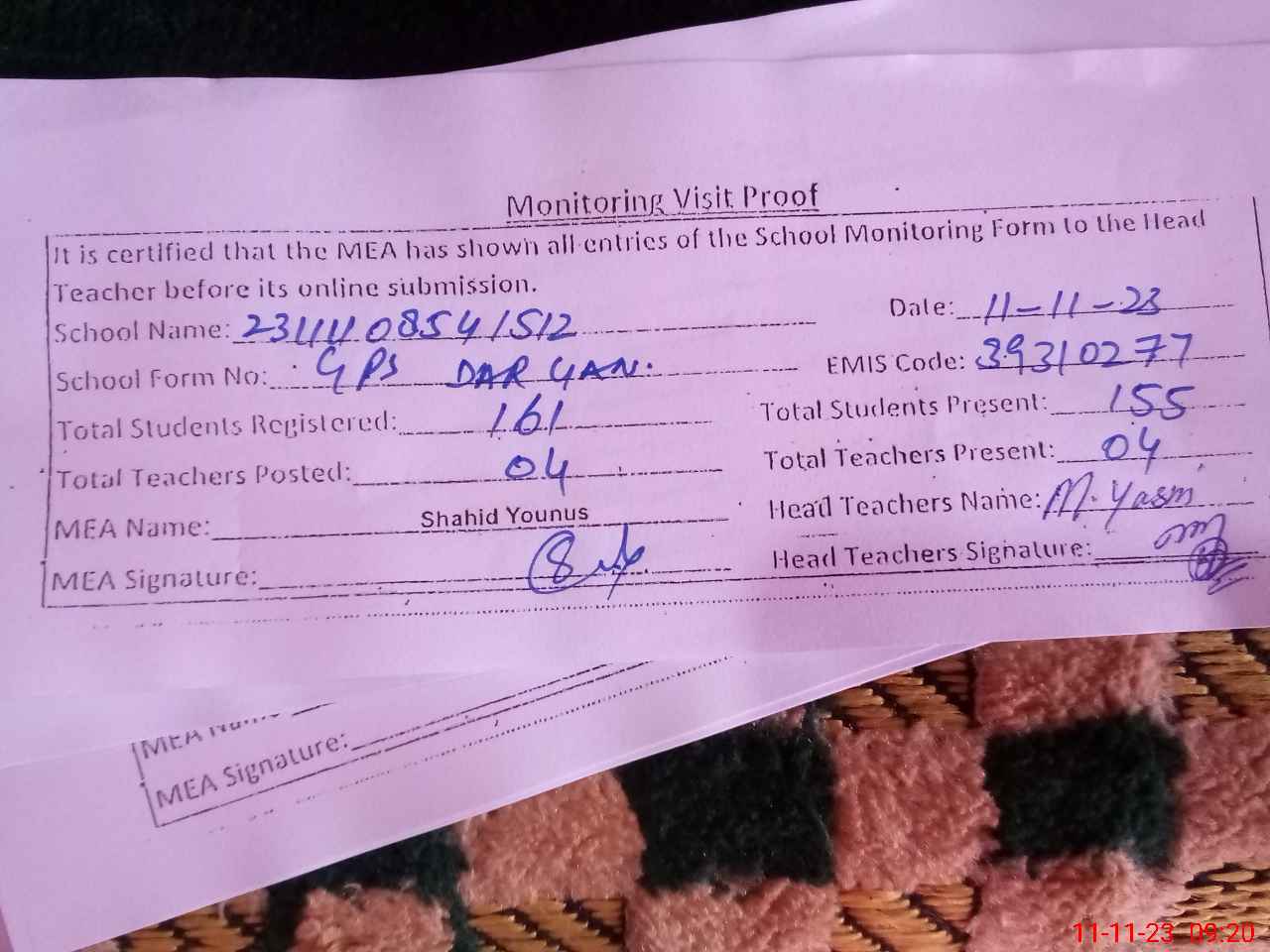 | Attendance Register | Head Teacher | MEA with School | Visit Proof |
