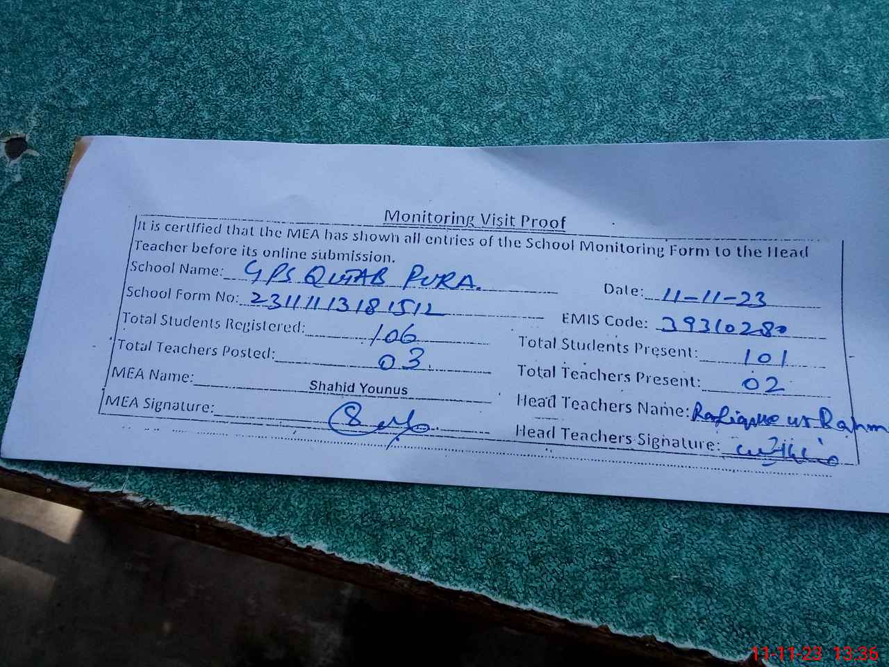 | Attendance Register | Head Teacher | MEA with School | Visit Proof |