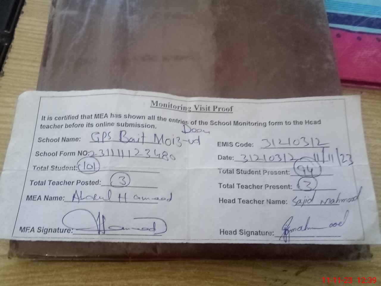 | EMIS Code: 31210312 | Name of School: GPS BAIT MOAZIZ-UD-DIN | |||