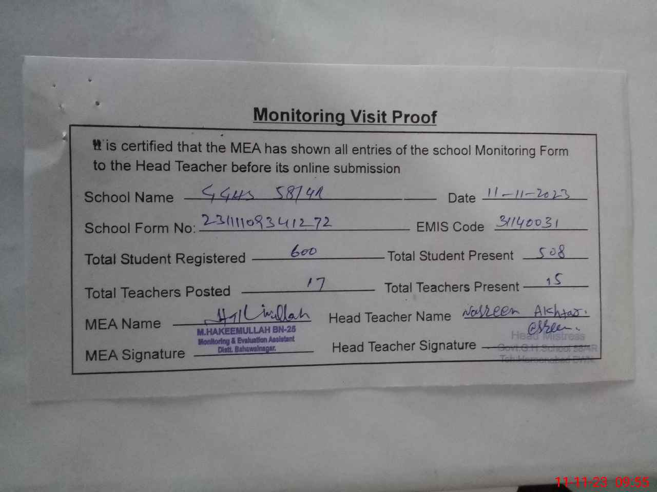 | Attendance Register | Head Teacher | MEA with School | Visit Proof |