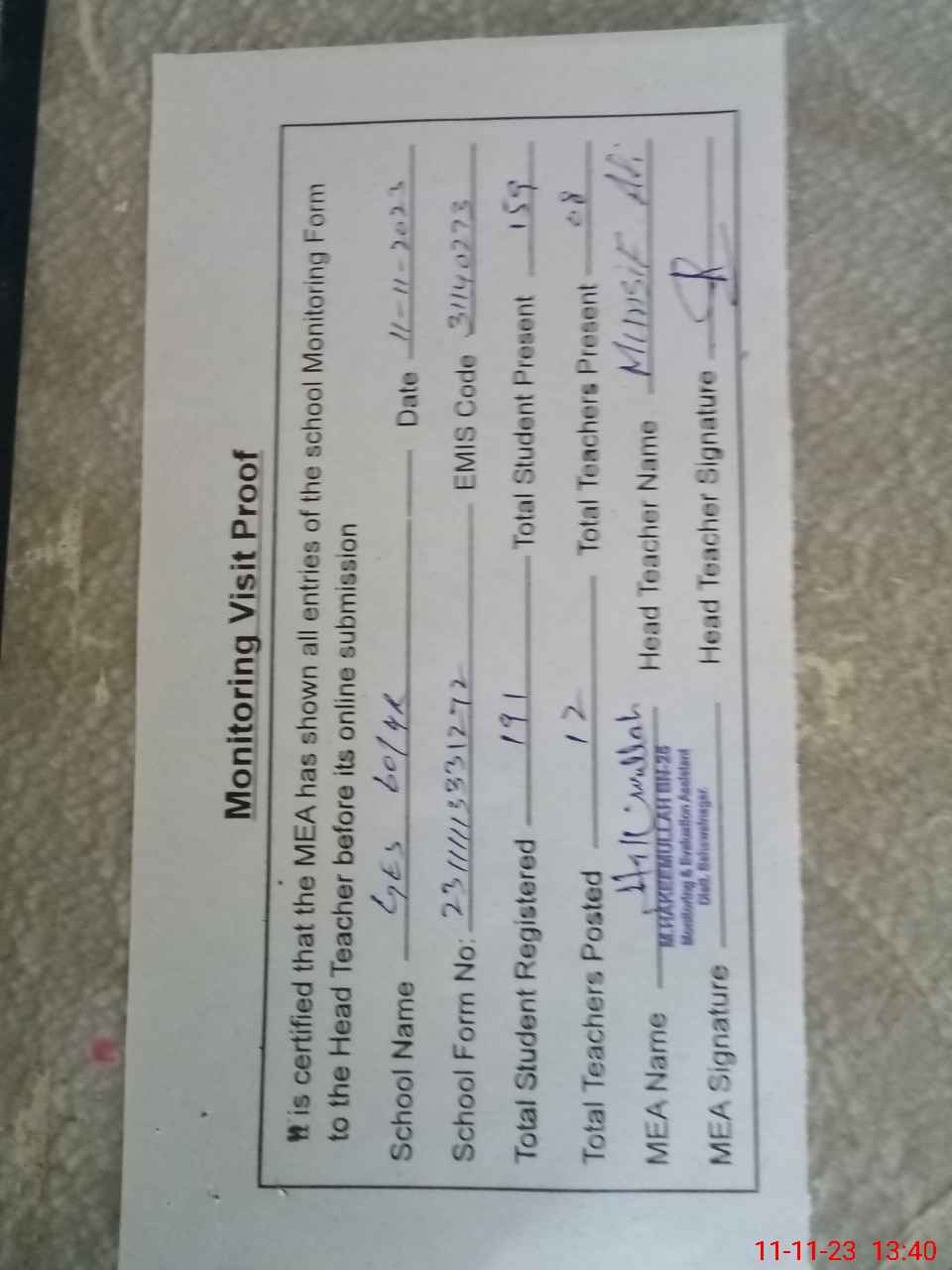| Attendance Register | Head Teacher | MEA with School | Visit Proof |