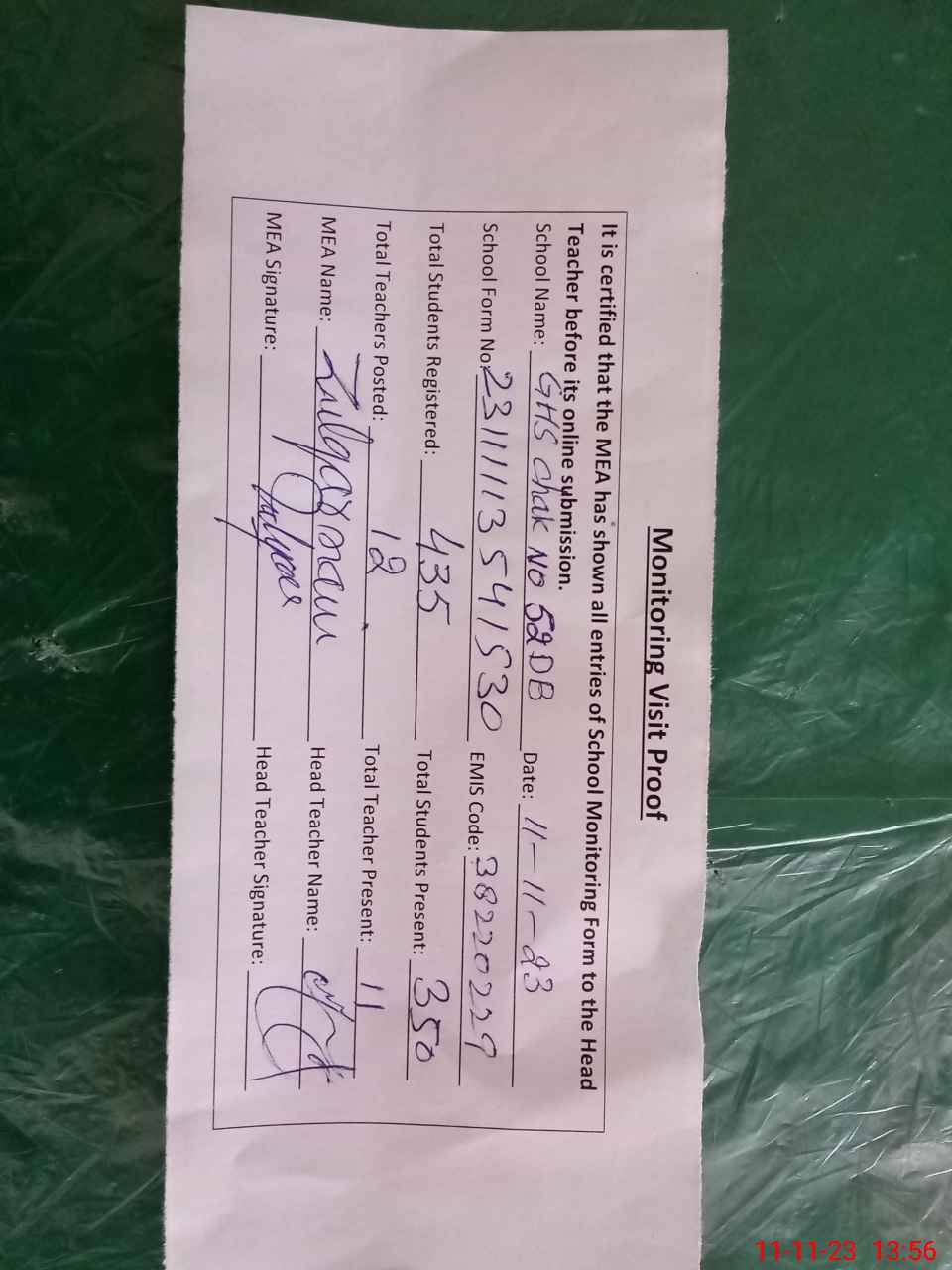 | Attendance Register | Head Teacher | MEA with School | Visit Proof |