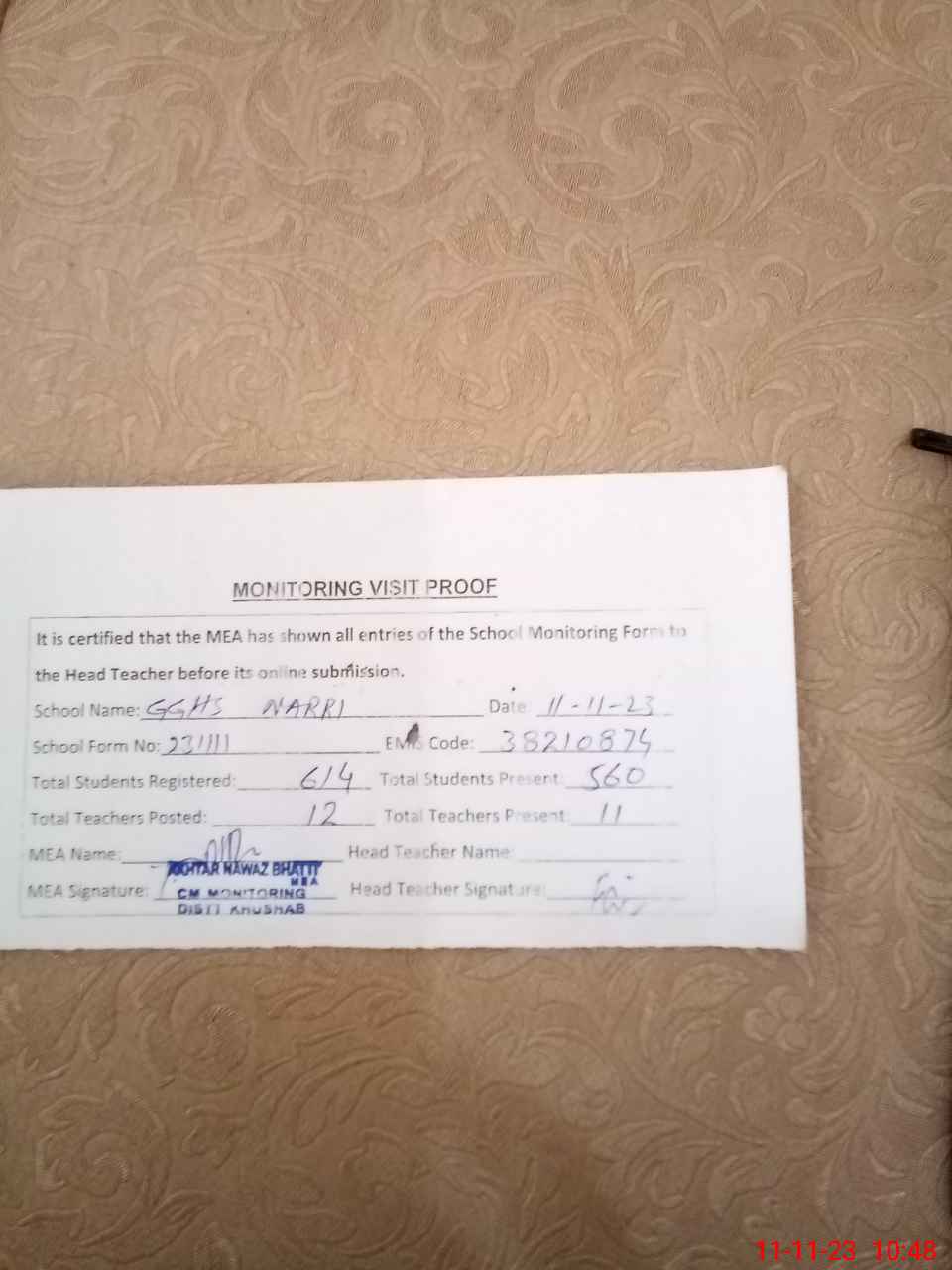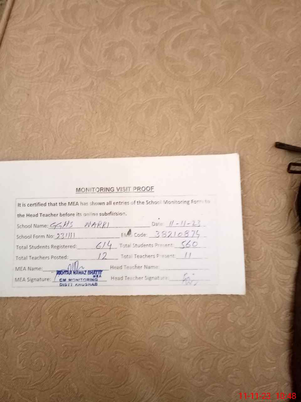 | Monitoring Date: 11-11-2023 | Start Time: 11-11-2023 10:15 AM | End Time: 11-11-2023 10:48 AM | Name of MEA: AK**** NA**** (R**** | |