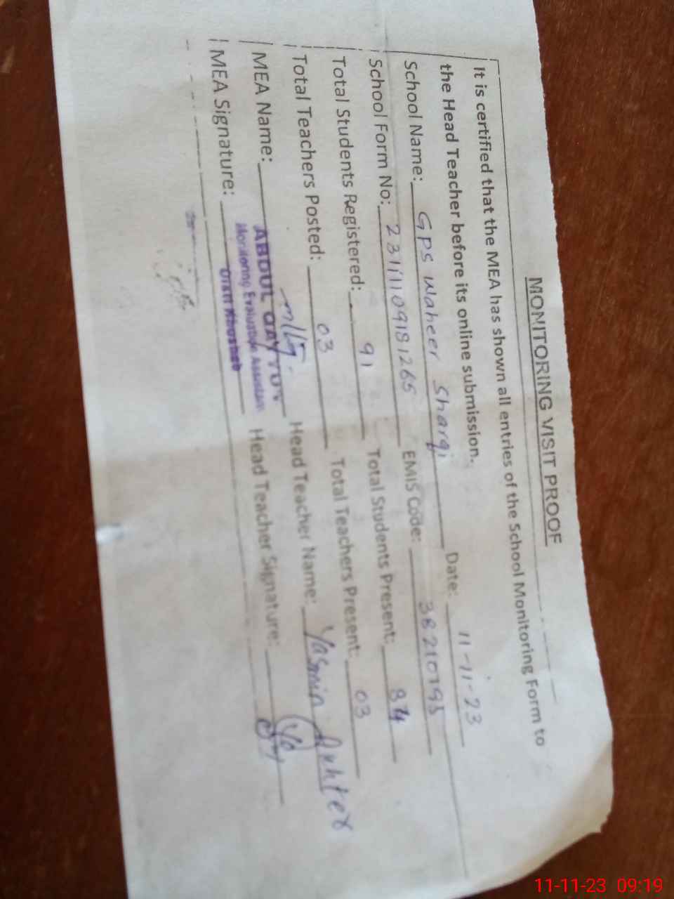 | EMIS Code: 38210195 | Name of School: GPS WAHEER SHARQI | |||