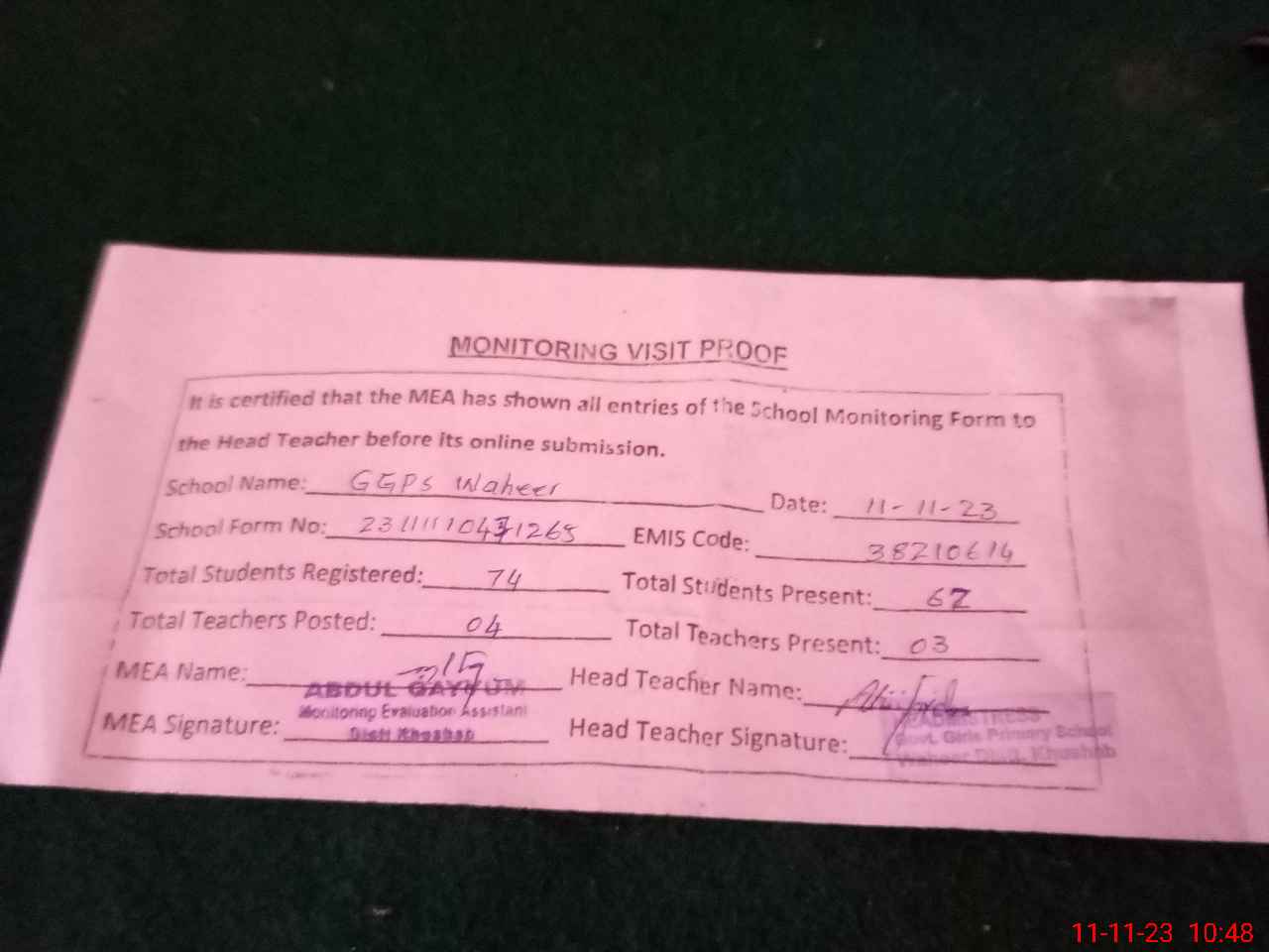 | Attendance Register | Head Teacher | MEA with School | Visit Proof |