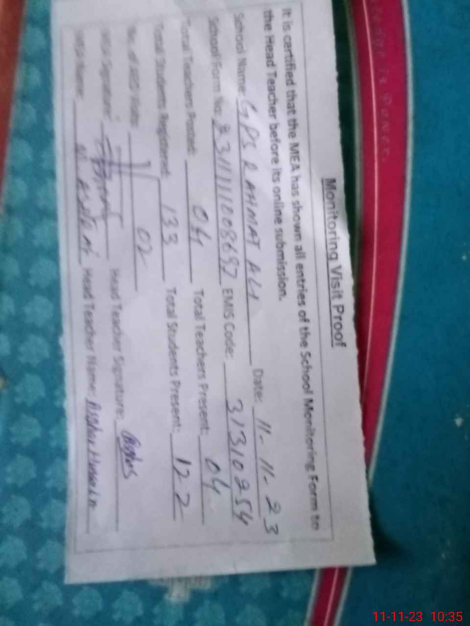 | Attendance Register | Head Teacher | MEA with School | Visit Proof |