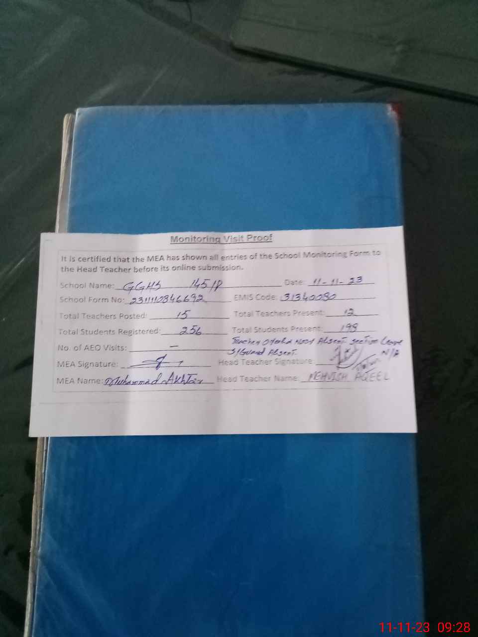 | Attendance Register | Head Teacher | MEA with School | Visit Proof |