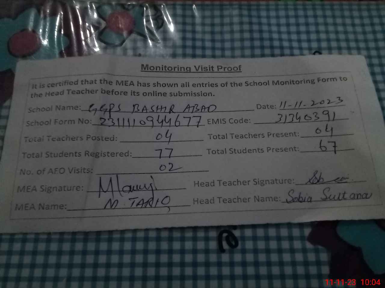 | Attendance Register | Head Teacher | MEA with School | Visit Proof |