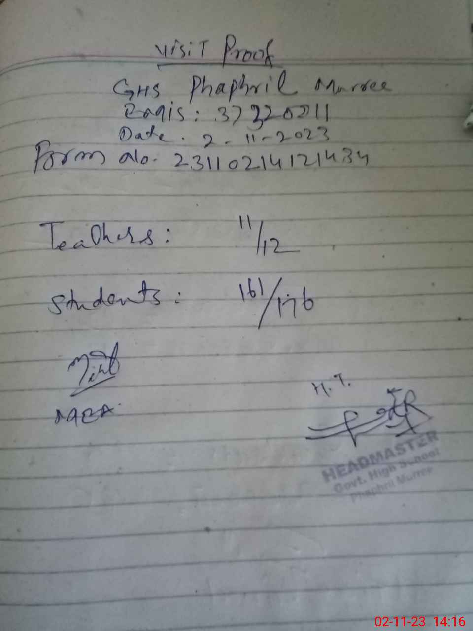 | Attendance Register | Head Teacher | MEA with School | Visit Proof |