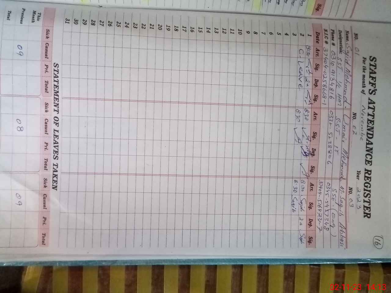 | CNIC | Full Name | Designation | R/C | Absence During Last Calender Month |