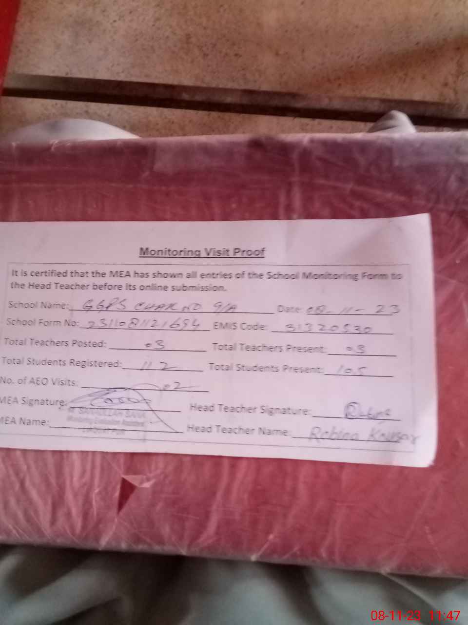 | Attendance Register | Head Teacher | MEA with School | Visit Proof |