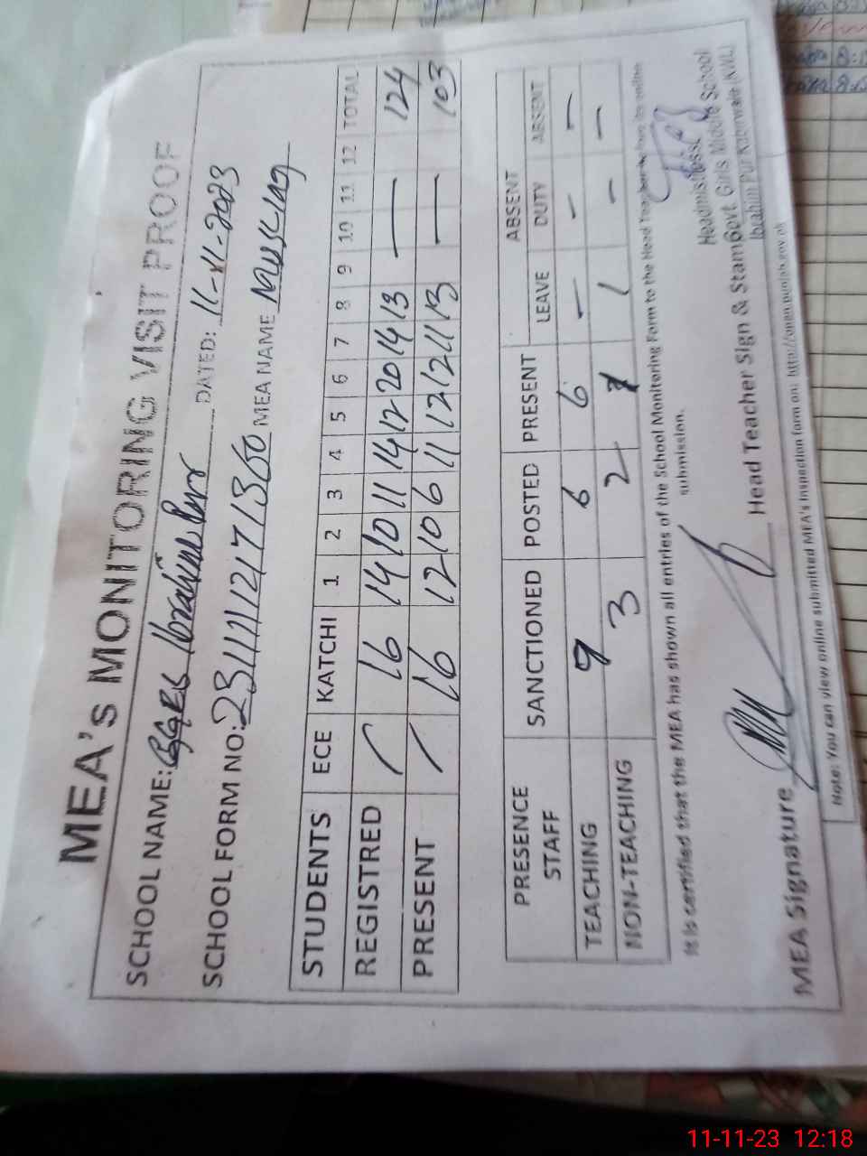 | Attendance Register | Head Teacher | MEA with School | Visit Proof |