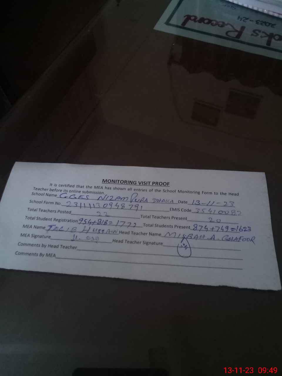 | Attendance Register | Head Teacher | MEA with School | Visit Proof |
