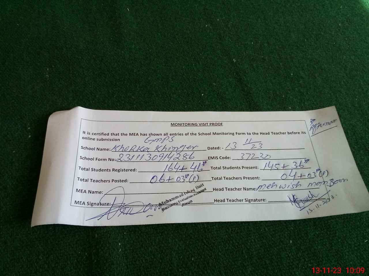 | Attendance Register | Head Teacher | MEA with School | Visit Proof |