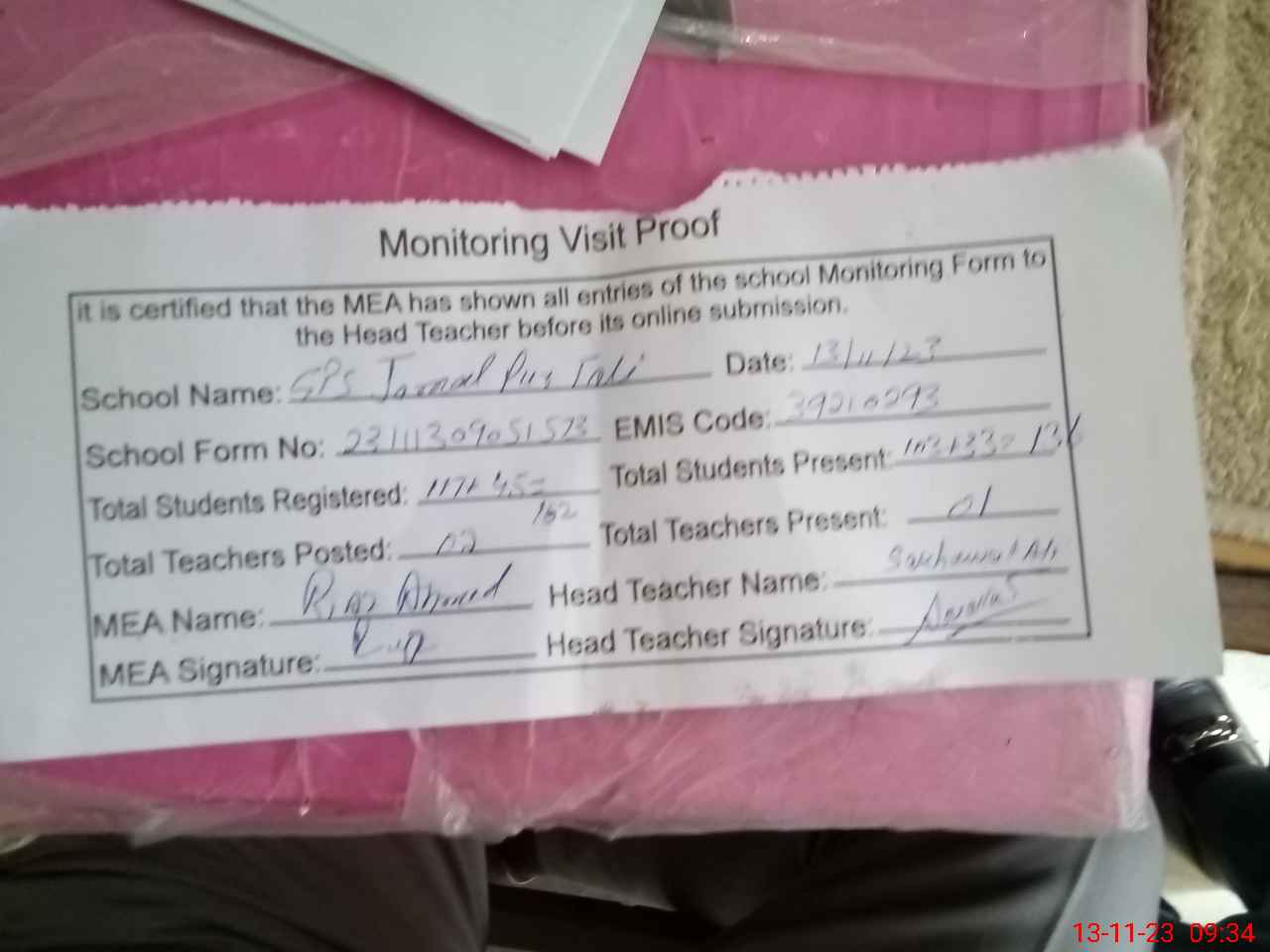 | Attendance Register | Head Teacher | MEA with School | Visit Proof |