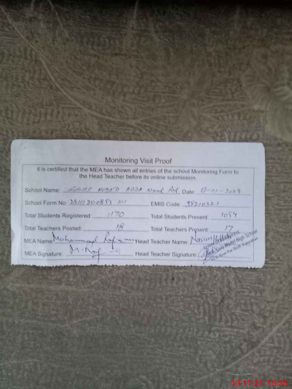 | Attendance Register | Head Teacher | MEA with School | Visit Proof |
