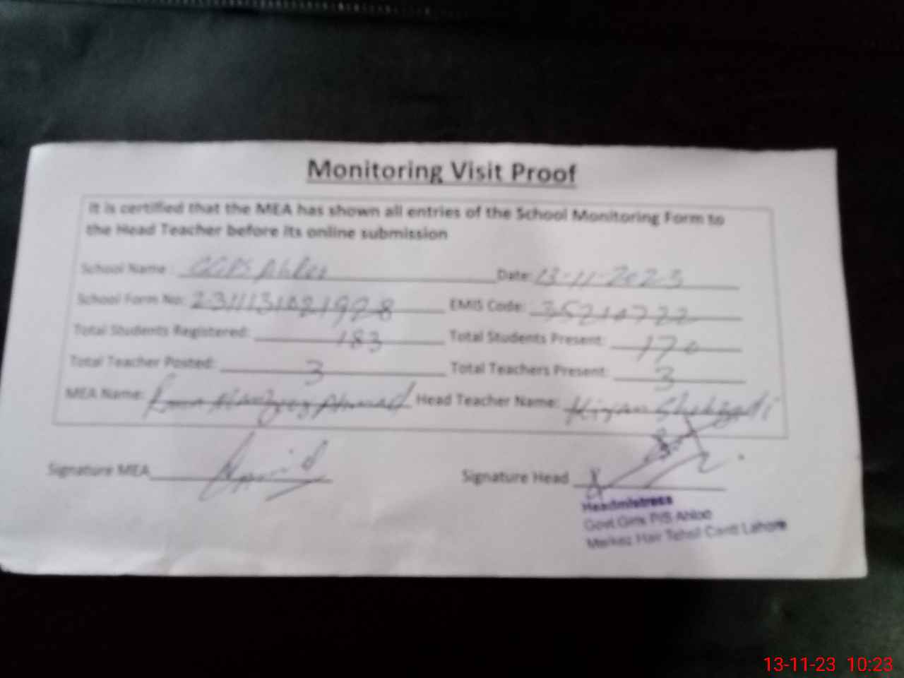 | Attendance Register | Head Teacher | MEA with School | Visit Proof |